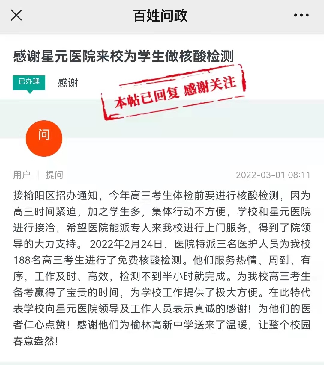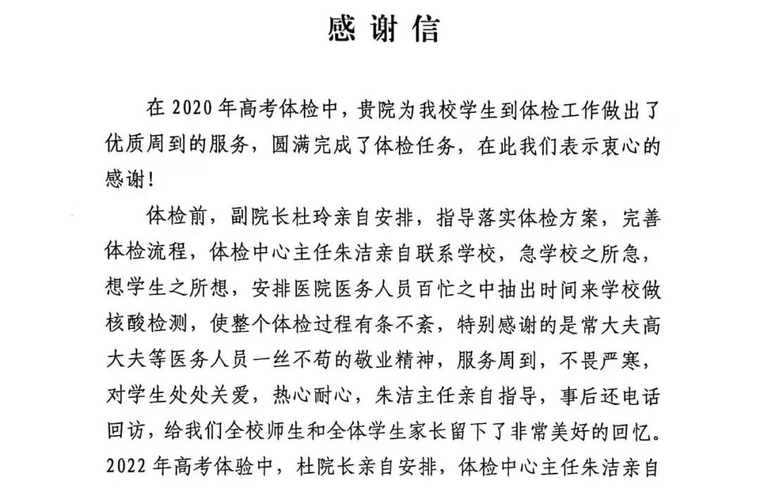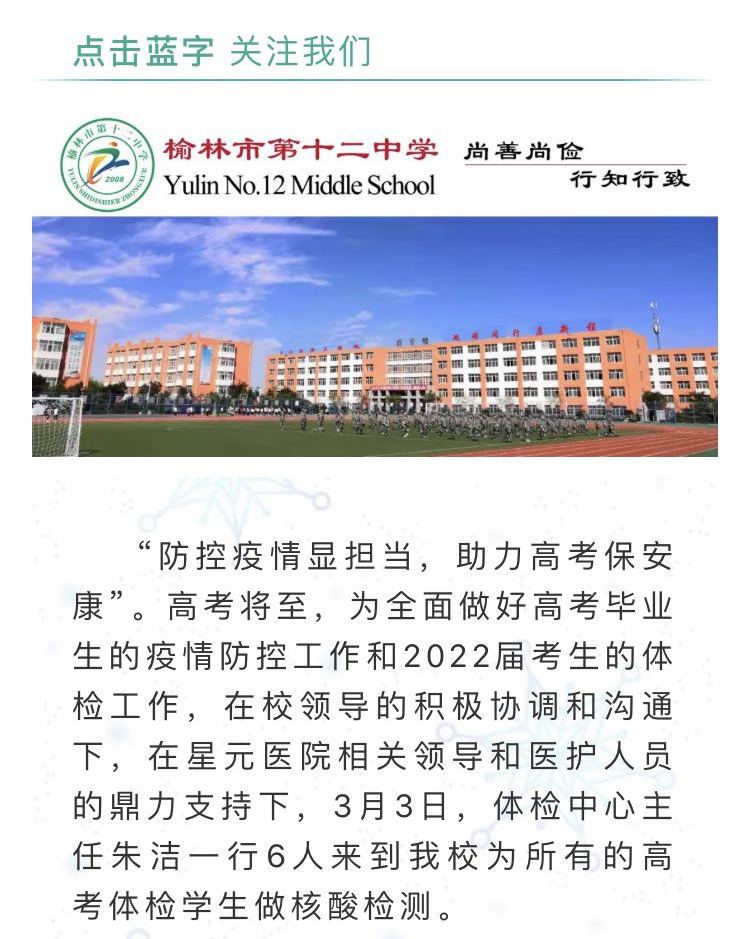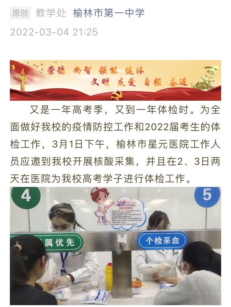 2月22日至3月5日,榆林市星元医院圆满完成2022年榆阳区高考体检工作,作为榆阳区高考体检定点医院,榆林市星元医院已连续23年承担了全区高考体检工作任务,此次先后为5200余名高考生进行了体检,受到学校老师及参检学生的一致好评。