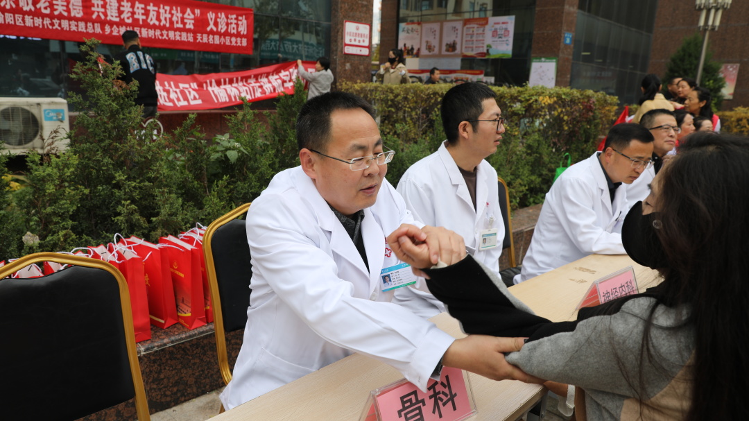 肿瘤科杨光博士、普外一科白卫兵主任、骨科乔永军副主任、老年病科杜鹏荣副主任及神经内科张勃副主任医师参加了此次义诊。医护人员认真为老年人测量血压、检测血糖,详细询问他们的日常身体状况、生活习惯以及用药情况,根据每个人的具体情况给出个性化的健康建议。针对高血压、糖尿病、心血管疾病等老年人高发的慢性疾病,志愿者们用通俗易懂的语言,向老人们普及疾病预防知识,讲解日常护理的注意事项,帮助大家树立 “早预防、早发现、早治疗” 的科学健康理念。