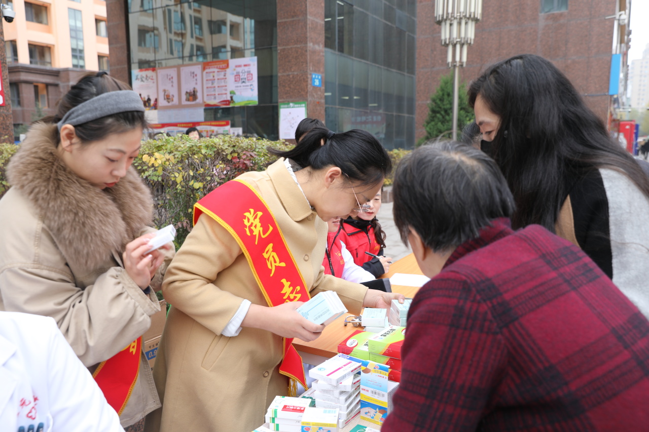 同时,现场工作人员还发放免费药品,向居民介绍星元医院大病救助基金的相关政策,为有需要的家庭详细解读救助申请流程,帮助他们了解获取救助的渠道。行政后勤岗位的党员们则积极做好配合工作,有的忙着发放健康宣传资料,有的引导居民有序排队,有的主动搀扶行动不便的老人,还有的认真记录老人们的健康需求,整个现场充满了温暖和谐的氛围。