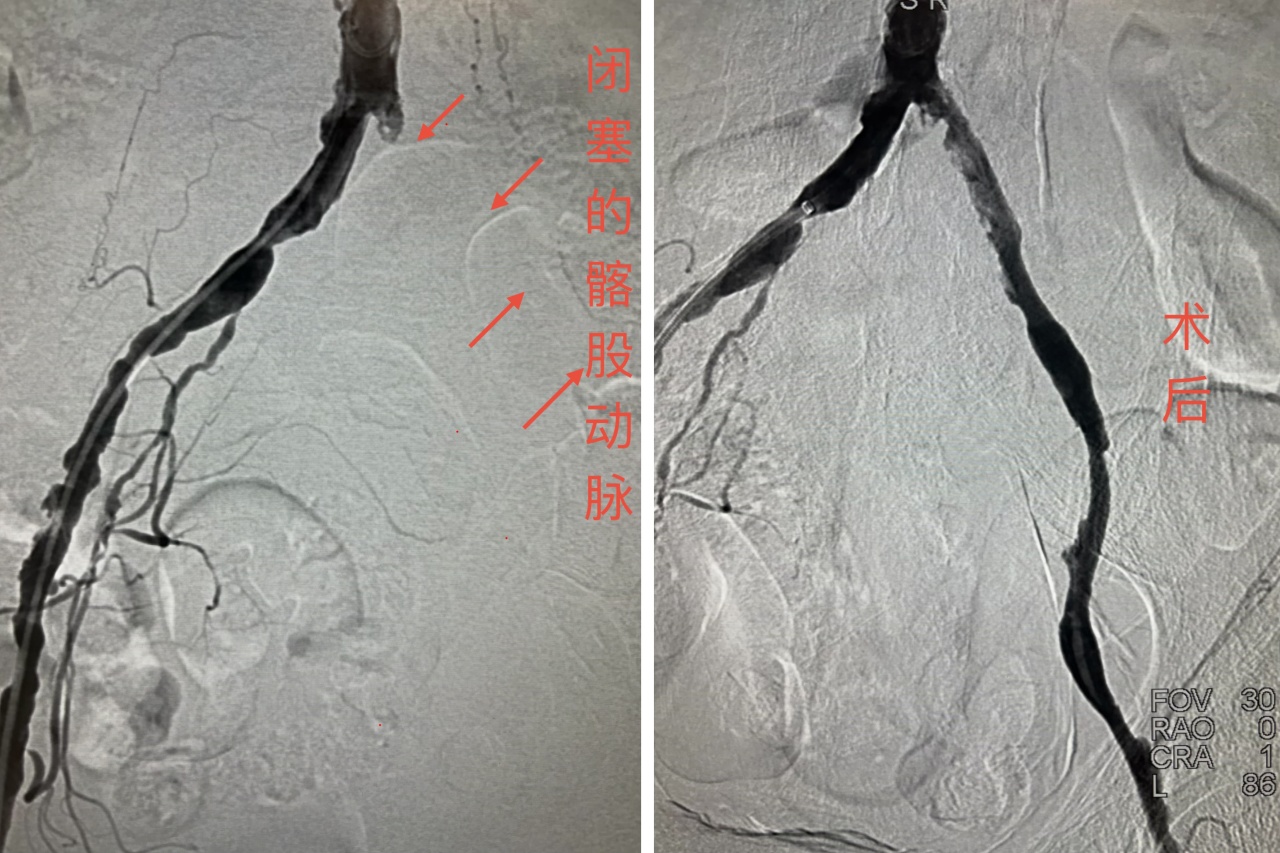 患者为老年男性,因“左下肢疼痛、麻木、无力20余天”从外院转入榆林市星元医院。入院时,患者左下肢青紫发凉、足端发灰,伴趾部溃疡,股动脉、腘动脉及足背动脉搏动均消失,ABI指数为0,急诊CTA确诊为左侧髂股动脉血栓性闭塞,Fontaine分期达3-4期,面临极高截肢风险。