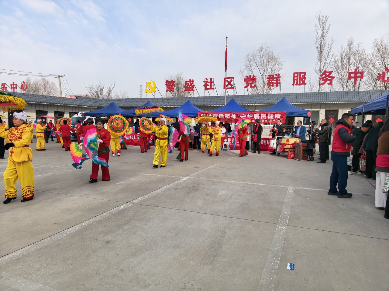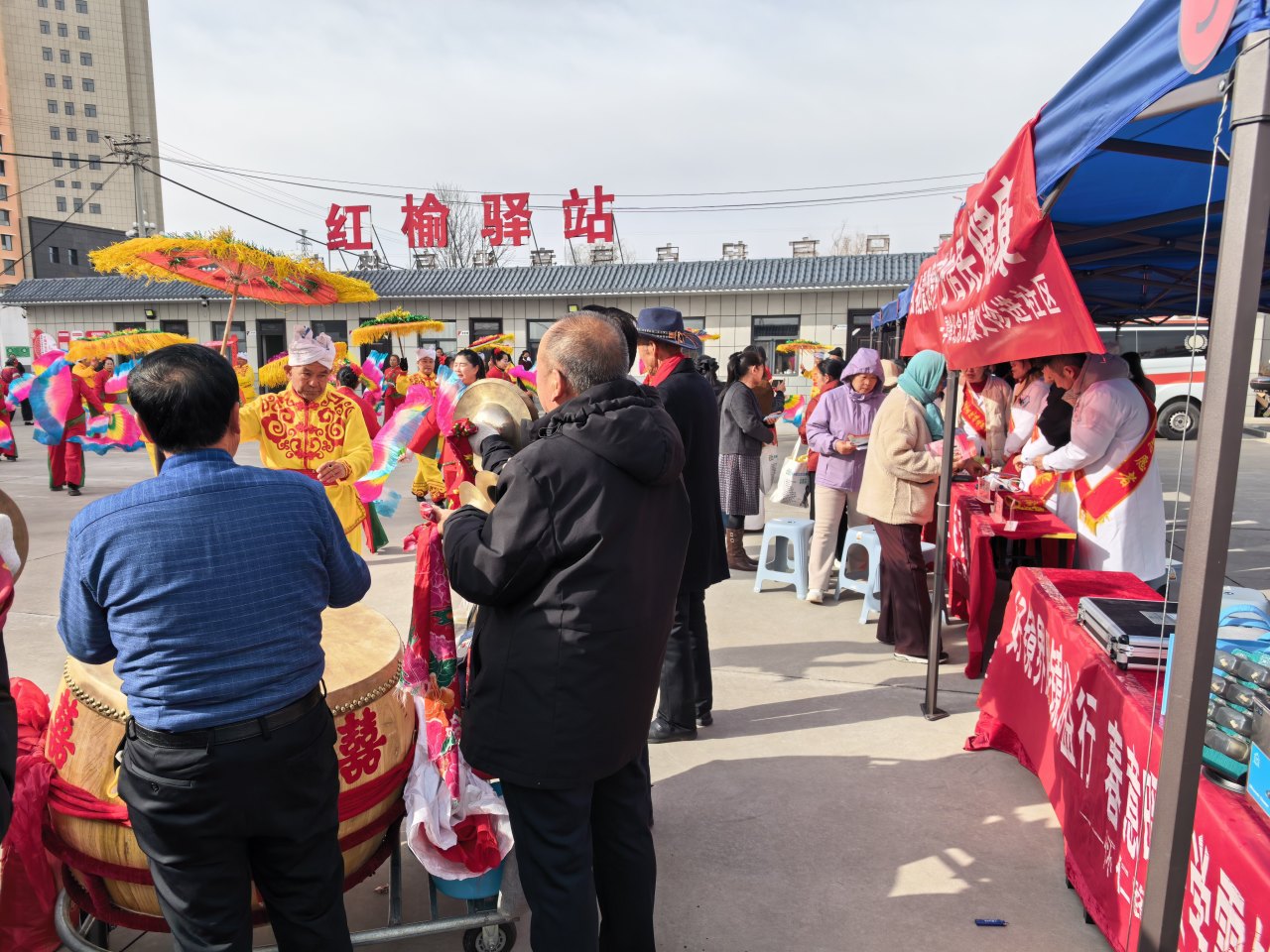 义诊现场气氛热烈又温馨,一旁的秧歌队身着鲜艳服饰,伴着欢快喜庆的锣鼓声翩翩起舞。红绸飞扬、舞步轻快,整齐划一的动作、热情洋溢的笑脸,为义诊活动增添了浓浓的节日氛围与乡土气息。大家在等候问诊的间隙欣赏精彩表演,欢声笑语不断。医护人员专心诊疗,秧歌队热情助兴,一边是守护健康的专业服务,一边是传递欢乐的民俗表演,生动展现出党群连心、其乐融融的和谐画面,让这场义诊既有温度,更有情怀。